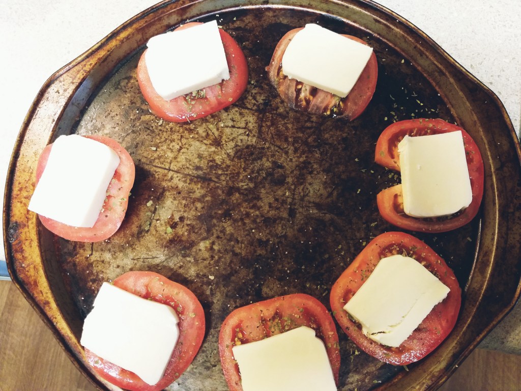 Cut tomatoes into thick slices and place on lightly oiled baking sheets, sprinkle salt, pepper and parsley flakes, cut fresh mozz into small thin squares and place on top of tomato slices, bake 10-15 minutes or until mozz melts over tomato slices.