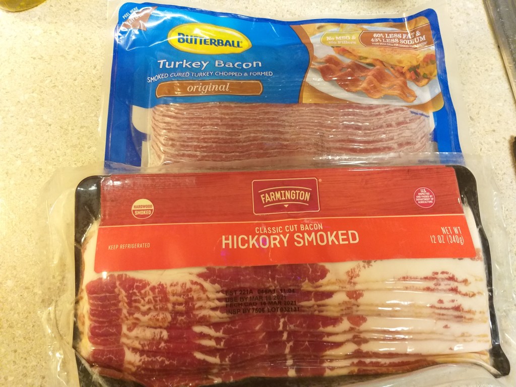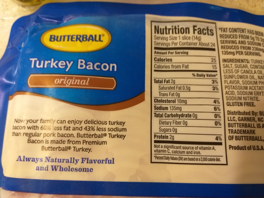Turkey Bacon, in place of regular bacon, Ground turkey in place of hamburger meat, turkey pepperoni in place of regular sausage pepperoni. The only downside to these? You will most likely want to use double the seasonings to give it more flavor as the only complaint I’ve had is a lack of taste. Turkey bacon especially I let cook a bit longer, and add salt and pepper to it.