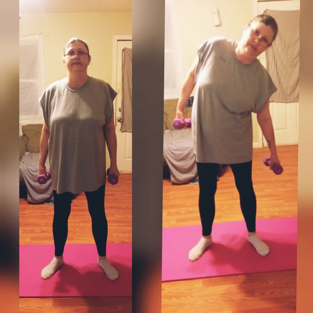 I myself have injuries from a car accident a few years ago that make arm exercises a bit difficult for me, so although I do them, I often have to move slower or hold my weights differently. My middle aged hamster has a slipped disc in her back, and some medical issues with her feet, so to make it easier for her we often do our floor exercises at the very end so she doesn’t need to get up and down.