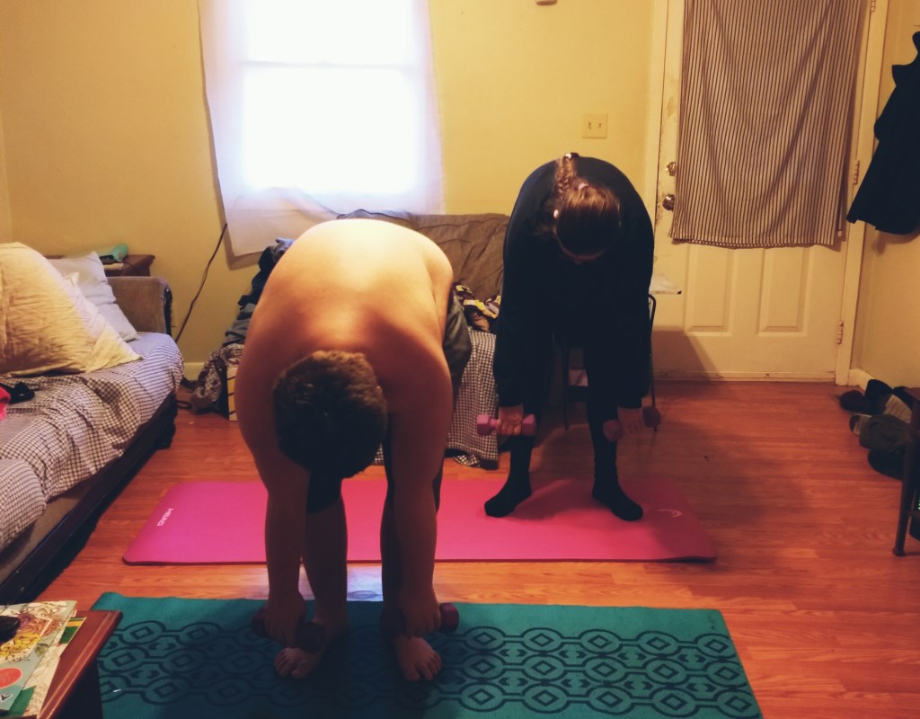 We didn’t start out with equipment at all, and before we got our 5 pound weights, we practised with cans to get used to the motions and holding something.