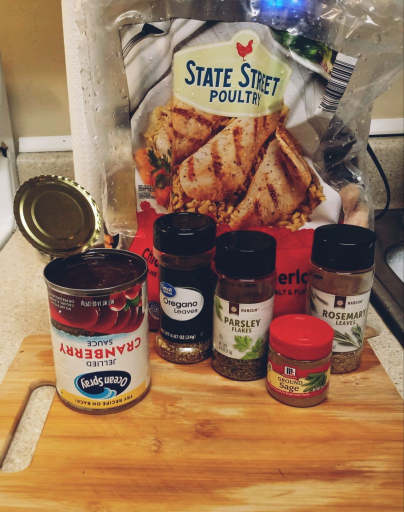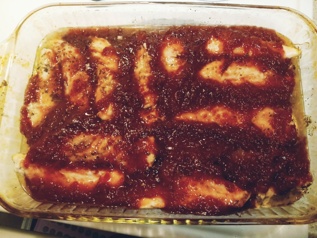 - Coat the bottom of a baking dish in olive oil lightly and place chicken in it, sprinkle seasoning over top and allow to bake for 30 minutes at 350. Take chicken out and spread cranberry sauce over it evenly before baking 30 minutes more at 400.