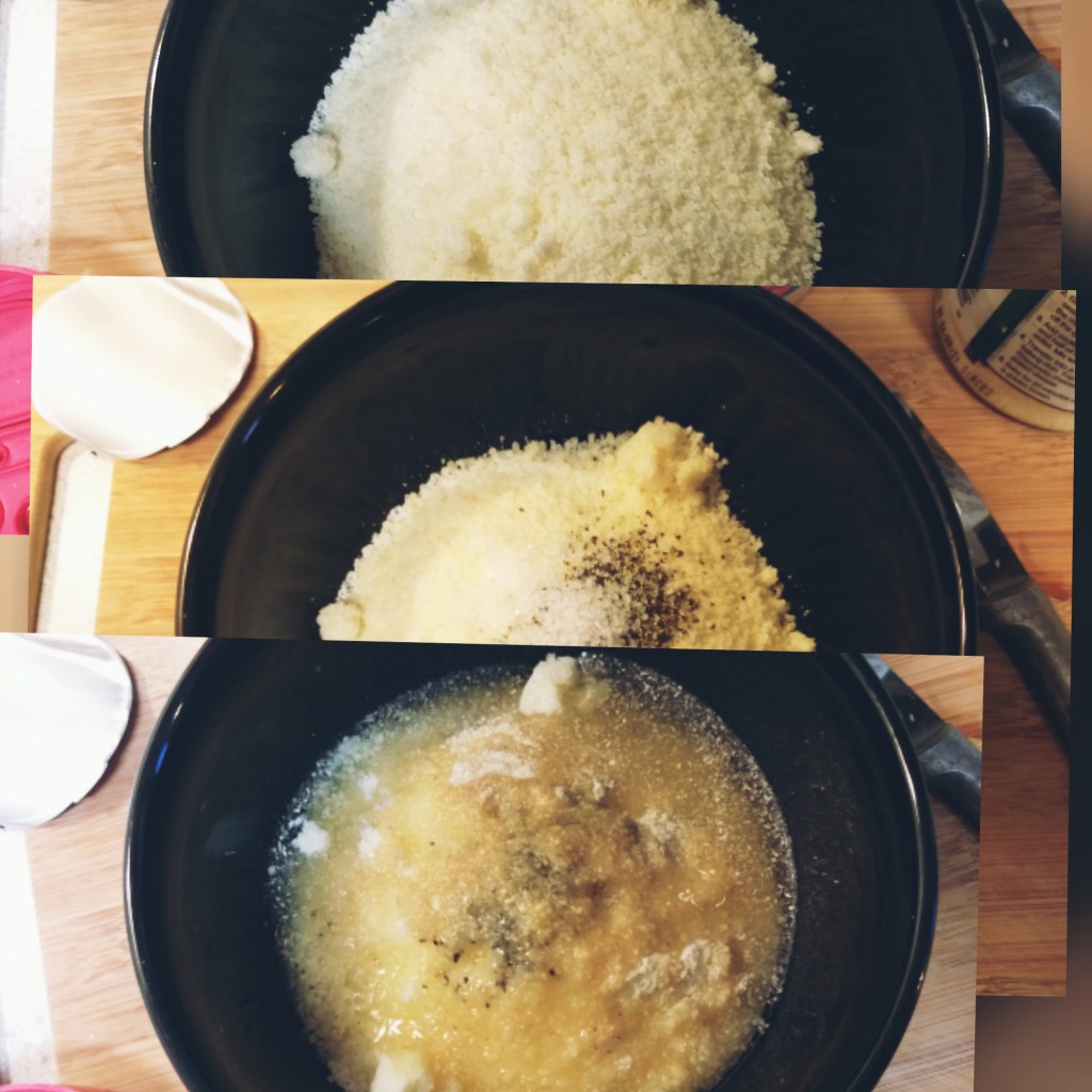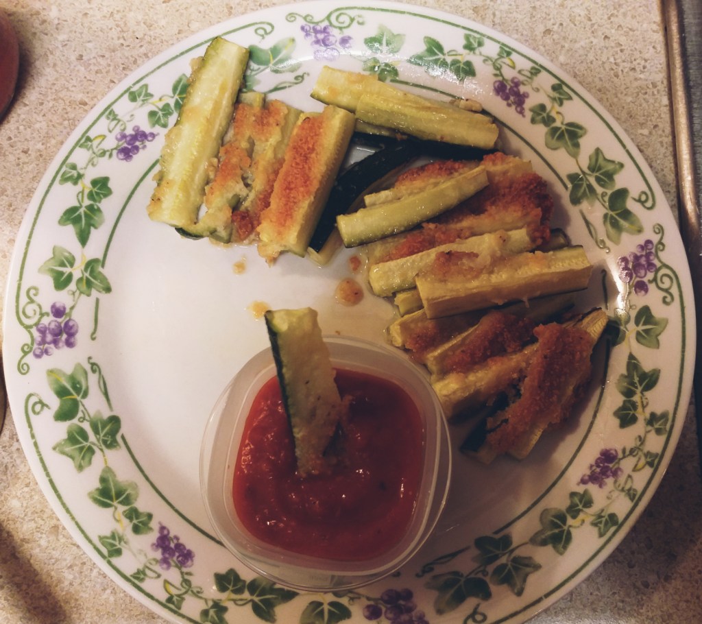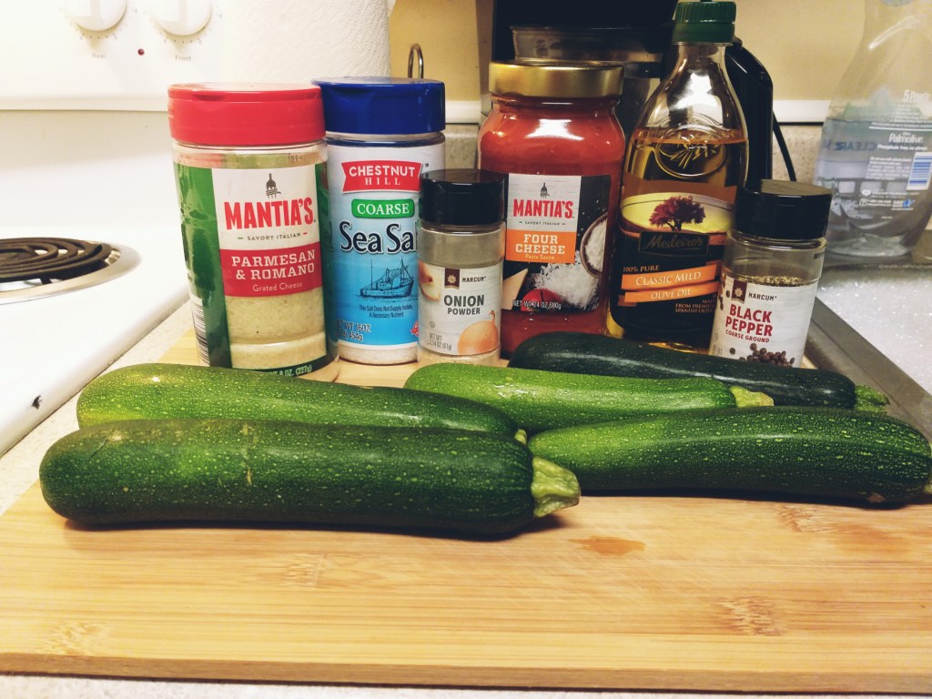 - Then dump your parmesan sprinkle, and seasonings into another bowl, and add olive oil. Mix that all together and lightly layer on top of Zucchini before popping them in the oven on 350, for around 20 minutes.