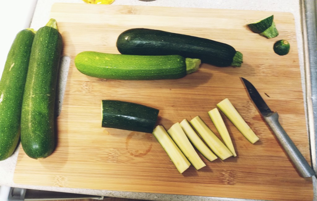 - First cut the ends off your zucchini, then cut it in half, and split your half down the middle, from there cut your 2 halved halves into smaller quarters whatever size you want them really.