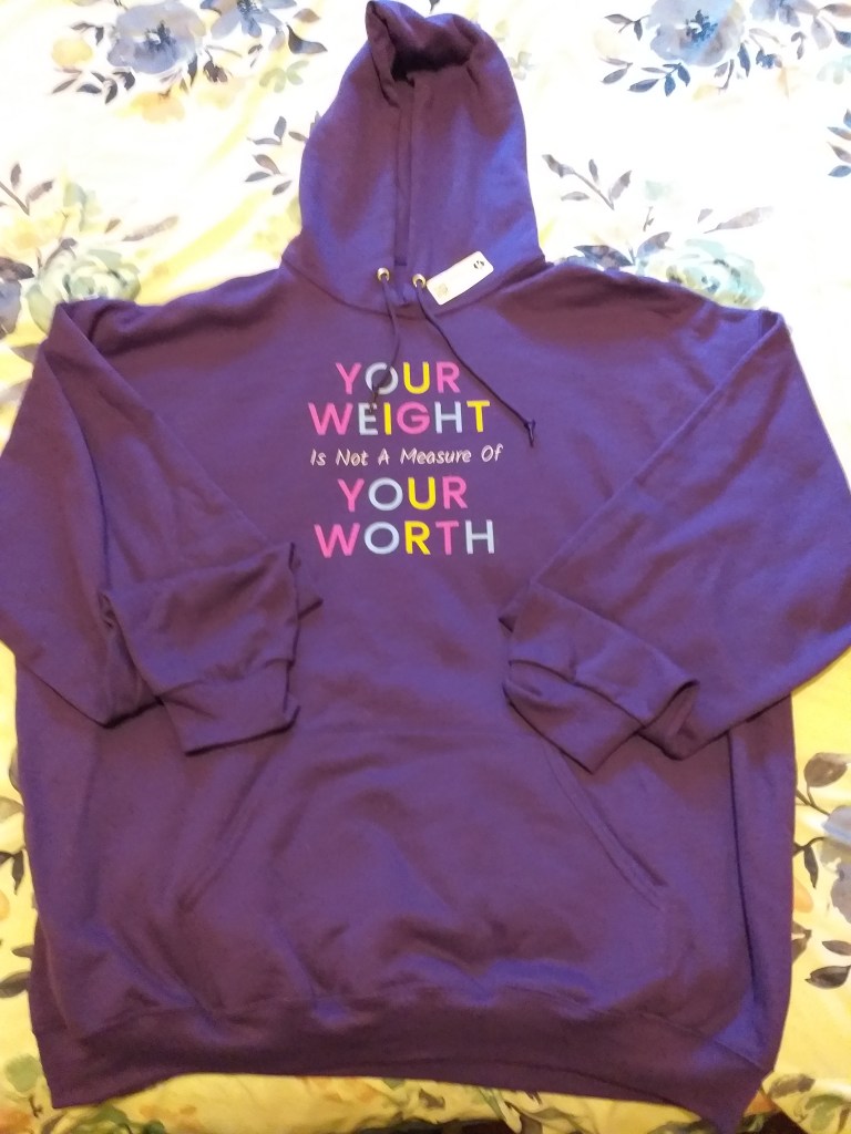 I really loved the hoodie, often when I buy hoodies or jackets, even buying 2 and 3 x’s it seems they just aren’t big enough, especially when compared to my husbands jackets, but this one was a perfect size, and just thick enough to keep me from freezing on my early spring 5a.m. walks.